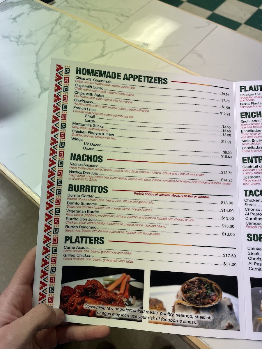 If you're looking to spice up your meal with vibrant flavors, the Don Julio Mexican Restaurant Menu has exactly what you need. Located at 10475 U.S. 522 S in Lewistown, PA, this spot serves up a mouthwatering variety of Mexican dishes that are as bold as they are delicious. Whether you're craving sizzling fajitas, savory tacos, or hearty enchiladas, there’s something to please every palate. You’ll find traditional favorites alongside unique creations, all made with fresh ingredients and that authentic Mexican flair. The menu also features a selection of refreshing drinks, from margaritas to ice-cold cervezas, making it the perfect spot for any occasion. With a warm and welcoming atmosphere, Don Julio's is more than just a place to eat-it’s an experience.